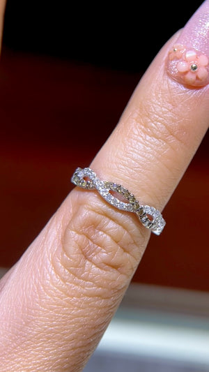This gorgeous wedding band features two intertwined rows of sparkling round brilliant diamonds. The wave-like twist design represents perfect harmony between two. This elegant wedding band is fashioned with sparkling round diamond on one row, and dazzling round brilliant chocolate diamonds set on darkened prongs on the other. The intertwined rows add a modern, curved design to your engagement ring.