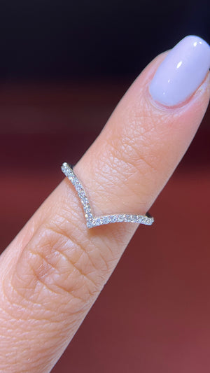 Simple, yet elegant, this tantalizing chevron diamond band is a great fit for multiple occasions. The perfect width to not take away from your engagement ring, this chevron band will be a good match for multiple diamond shapes and sizes. The simplicity of the chevron band allows you to match this ring with your engagement ring, and create an elegant set.