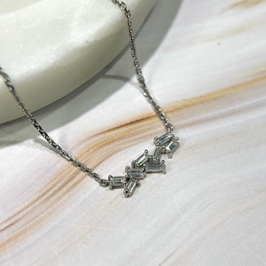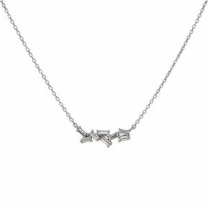 This piece consists of eight baguettes clustered up in various sizes. This arrangement of cluster allows light to reflect with every movement. This dainty piece has its own charm; which is its' modern sophistication with a hint of vintage. The pendant's minimalist silhouette makes it perfect for layering with other pieces or even as a stand-alone statement for everyday.