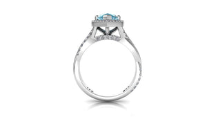 Give her an everlasting love with this breathtaking single diamond twist pear cut blue topaz engagement ring. This mesmerizing engagement ring was made to feature the pear cut. A unique  diamond twist band, combined with a trendsetting pear cut morganite. The center stone is set with a lovely 9x6mm(1.30 carat) pear blue topaz and a diamond halo for maximum sparkle. One of the fanciest shapes available, our pear blue topaz ring is fashioned with a beautiful baby blue and a diamond halo, giving it an enchanting brilliance unmatched by other stones.