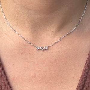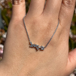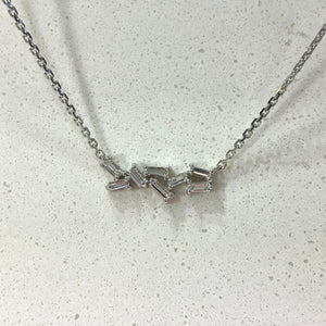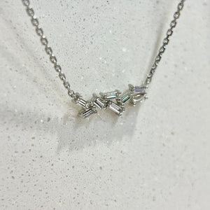This piece consists of eight baguettes clustered up in various sizes. This arrangement of cluster allows light to reflect with every movement. This dainty piece has its own charm; which is its' modern sophistication with a hint of vintage. The pendant's minimalist silhouette makes it perfect for layering with other pieces or even as a stand-alone statement for everyday.