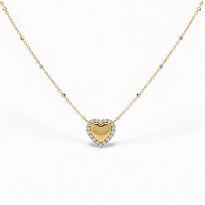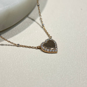 Set on a dainty chain dotted with subtle black enamel accents, the center heart is finished in polished gold and framed by a halo of brilliant pavé stones. It’s sweet without being too soft—perfect for layering or wearing solo when you want just a hint of shimmer.
