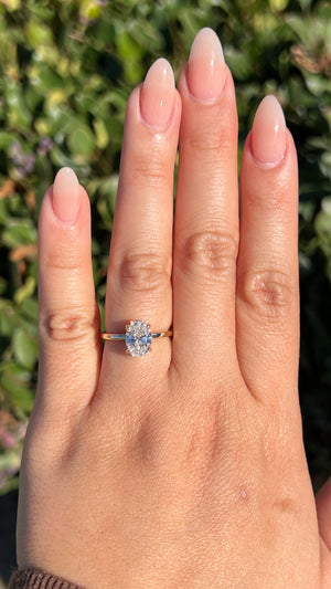 The Sadie features a lab grown oval diamond with a beautiful secret halo set in a modern floating setting. The gorgeous secret halo follows the shape of the center stone to create a beautiful design that is for your eyes only. The Sophi uses a 1.6mm gold band that centers all the focus onto the diamond. The oval diamond is elongated and cut like a 1.80ct size