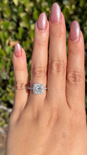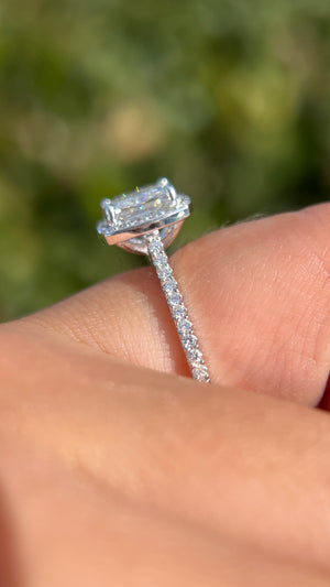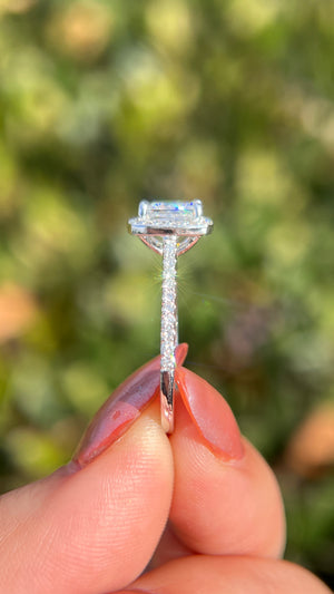 The Lily features a lab grown princess diamond set in a diamond halo on a cathedral setting. The setting uses a 1.7mm pave classic diamond band and it is the perfect proportion. The center stone is surrounded by a beautiful diamond halo that complements the center diamond.