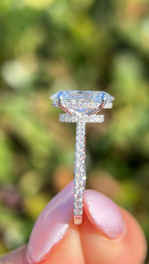 The Jenni features a lab grown oval diamond with a beautiful double hidden and secret halo set in a modern floating setting. The gorgeous secret halo follows the shape of the center stone to create a beautiful design that is for your eyes only. Diamonds sit on the pave band to add brilliance and fire to a beautiful modern pave setting. The oval diamond is nicely elongated, looks like a 4.40ct
