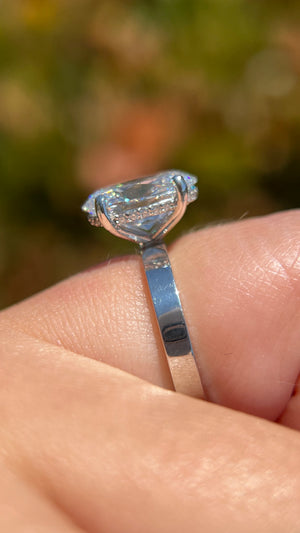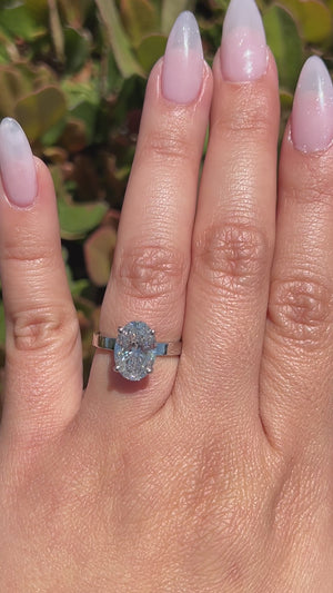 The Andrea features a lab grown oval diamond set in a stunning floating solitaire setting. The Andrea is a trendy and thicker solitaire than usual. It uses a 3.5mm comfort fit solitaire band that focuses all the attention on the gorgeous oval diamond. The oval diamond is elongated and cut like a 3.40ct
