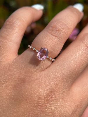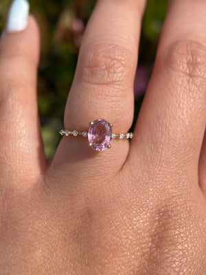 Enhance your everyday jewelry game with the beautiful dainty Bella in Gems. The Bella utilizes a spaced diamond band style to create a unique design that sparkles on the sides and stays focused in the middle. A favorite choice for many, the Bella is fitted with a 8x6mm natural pink tourmaline at the center, which is known for its beautiful vibrant pink color with an unmatched brilliance.