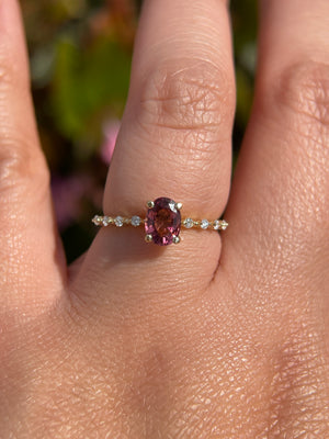 Enhance your everyday jewelry game with the beautiful dainty Bella in Gems. The Bella utilizes a spaced diamond band style to create a unique design that sparkles on the sides and stays focused in the middle. A favorite choice for many, the Bella is fitted with a 7x5mm natural oval pink tourmaline at the center, which is known for its beautiful vibrant pink color with an unmatched brilliance.