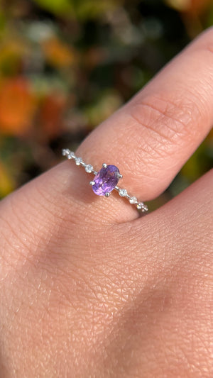 Enhance your everyday jewelry game with the beautiful dainty Bella in Gems. The Bella utilizes a spaced diamond band style to create a unique design that sparkles on the sides and stays focused in the middle. A favorite choice for many, the Bella is fitted with a 6x4mm natural oval amethyst at the center, which is known for its beautiful vibrant purple.