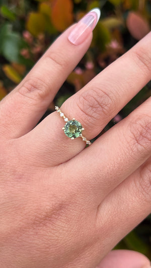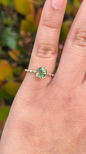 Enhance your everyday jewelry game with the beautiful Bella in Gems. The Bella utilizes a spaced diamond band style to create a unique design that sparkles on the sides and stays focused in the middle. A favorite choice for many, the Bella is fitted with a 6.5mm natural round green tourmaline at the center, which is known for its beautiful forest green color. An exceptional green tourmaline is set in the Bella