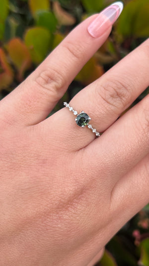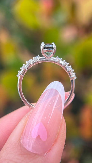Enhance your everyday jewelry game with the beautiful Bella in Gems. The Bella utilizes a spaced diamond band style to create a unique design that sparkles on the sides and stays focused in the middle. A favorite choice for many, the Bella is fitted with a 5x4.5mm natural oval green sapphire at the center, which is known for its deep and sparkly, green-blue color.