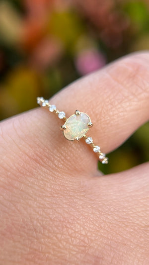 Enhance your everyday jewelry game with the beautiful dainty Bella in Gems. The Bella utilizes a spaced diamond band style to create a unique design that sparkles on the sides and stays focused in the middle. A favorite choice for many, the Bella is fitted with a 6x4mm natural oval opal at the center, which is known for its fiery brilliance and color.