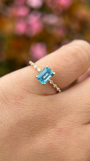 Enhance your everyday jewelry game with the beautiful dainty Bella in Gems. The Bella utilizes a spaced diamond band style to create a unique design that sparkles on the sides and stays focused in the middle. A favorite choice for many, the Bella is fitted with a 7x5mm natural emerald cut blue topaz at the center, which is known for its beautiful, sky blue color.