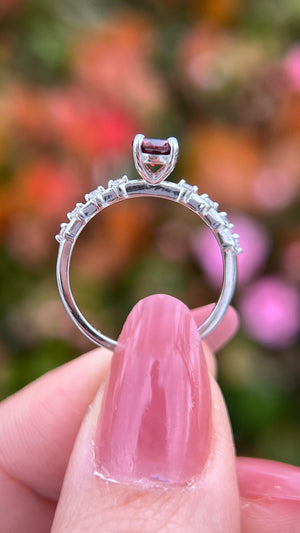 Enhance your everyday jewelry game with the beautiful dainty Bella in Gems. The Bella utilizes a spaced diamond band style to create a unique design that sparkles on the sides and stays focused in the middle. A favorite choice for many, the Bella is fitted with a 5mm natural round garnet at the center, which is known for its stunning, bright and brilliant red colors.