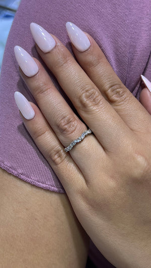 This charming wedding band is decorated with a beautiful alternating twist of marquise and round brilliant diamonds. Beautiful and unique, the diamonds go half way around the band. A true meaning to individuality. The unique adds a fresh and modern appeal. The perfect addition for someone looking to add a little spice to their engagement ring, but also unique enough to work as a solo piece.
