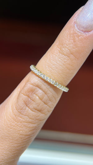 A classic wedding diamond band that is set with round brilliant diamonds in a pave setting. This classic pave wedding band will compliment any engagement ring because it is so simple, yet so beautifully paired. Crafted in 14K gold, the ring is very durable and strong. Since this diamond band is simple, it attracts more attention to the engagement ring. Can be worn as a standalone ring.