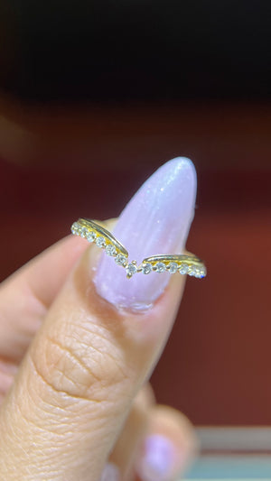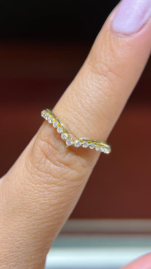 This unique Chevron band adds another layer of diamonds on the top half bringing the width to a 3.0mm while the bottom of the band is 1.5mm. All the diamonds are held together by a shared prong and give off the illusion of a thicker band. Fashioned in 14k solid gold this Chevron band utilizes shared prongs to its advantage by having less gold covering the diamond, thus bringing out the brilliance of the diamonds.