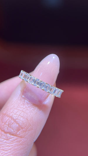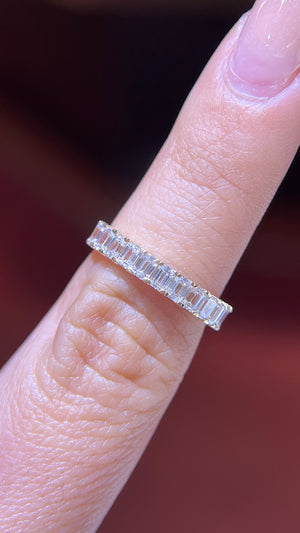 This diamond band utilizes shared prongs in order to have the least amount of gold covering the surface of the emerald cuts. The band tapers off and leaves the bottom thinner than the top so that all the focus could be on top. Fashioned in 14k solid gold, this band pairs extremely well with an engagement ring or can act as a standalone piece.