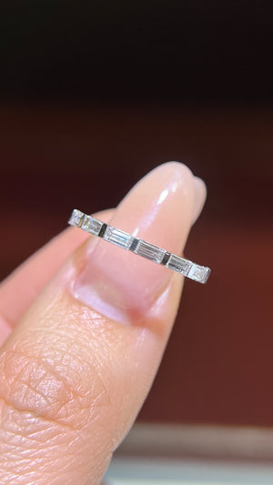 This baguette band has 7 baguette diamonds set horizontally with the band. Setting the baguettes horizontally in a channel set instead of vertically makes the band more dainty and not as chunky. This dainty piece is perfect for any fashionable and dainty lovers because it will look best worn with other rings. Fashioned in 14k solid gold, this band can be stacked with other rings or even act as a standalone piece.