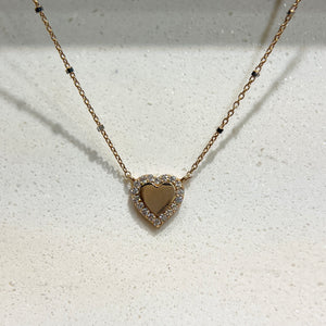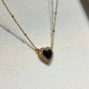 Set on a dainty chain dotted with subtle black enamel accents, the center heart is finished in polished gold and framed by a halo of brilliant pavé stones. It’s sweet without being too soft—perfect for layering or wearing solo when you want just a hint of shimmer.