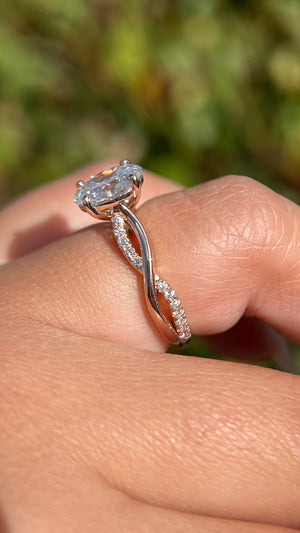 The Lana features a lab grown oval diamond with a hidden halo in a cathedral setting. The Lana features an opened half diamond twist band to create a beautiful blend of brilliant natural round diamonds and polished gold. The oval diamond is elongated and cut like a 1.80ct size