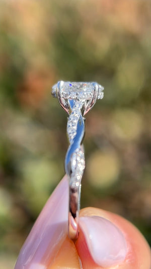 The Lena features a lab grown oval diamond with a hidden halo in a cathedral setting. The Lena uses a half diamond twist band to create a beautiful blend of brilliant natural round diamonds and polished gold. The oval diamond is elongated and cut like a 1.40ct size