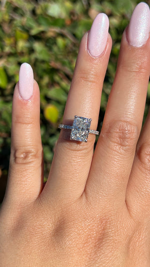 The Jada features a lab grown radiant diamond with a hidden halo in a tiffany floating setting. The Jada uses a 1.7mm pave classic diamond band to create a gorgeous dainty style that blends modern with timeless. The radiant diamond is elongated and cut like a 4.0ct size