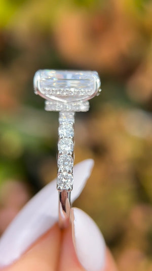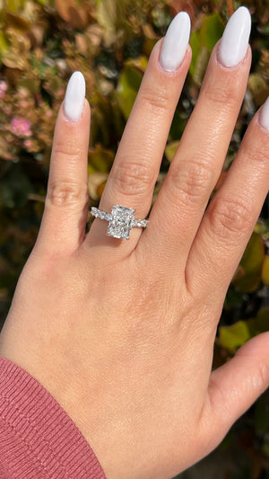 The Carli features a stunning lab grown radiant diamond with a our signature secret halo + hidden halo combo. The Carli is an absolute eye-catcher. Based off of 2 of our most glamorous ring style, The Christi and The Sandy. Carli features a u-prong setting with stunning 2.5mm F-VS clarity lab grown round brilliant diamonds. The radiant diamond is elongated and cut like a 4.35ct size.
