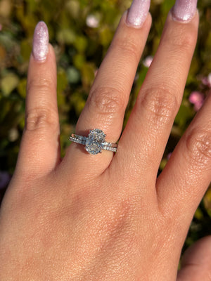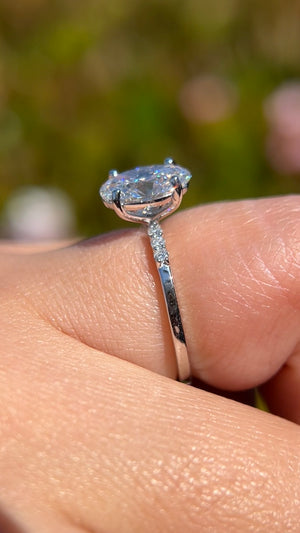 The Kat features a lab grown oval diamond with a hidden halo in a tiffany floating setting. The Kat uses a 1.6mm pave classic diamond band to create a gorgeous dainty style that blends modern with timeless. The oval diamond is elongated and cut like a 2.15ct size