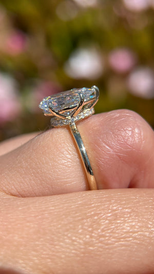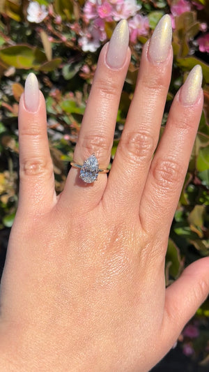 The Sophi features a lab grown pear diamond with a beautiful hidden secret halo set in a modern floating setting. The gorgeous secret halo follows the shape of the center stone to create a beautiful design that is for your eyes only. The Sophi uses a 1.8mm gold band that centers all the focus onto the diamond. The pear diamond is elongated and cut like a 3.50ct size