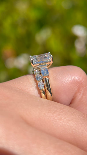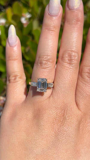 The Everly features a stunning lab grown emerald diamond in a beautiful 3-stone emerald diamond setting. The Everly features stunning high quality CVD lab grown diamonds that are perfectly sized and add a lot of fancy sparkle and centers all the focus towards the middle. The emerald diamond is elongated and cut like a 3.85ct size.