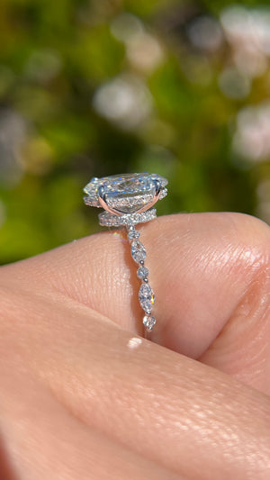 The Mari features a lab grown oval diamond with a unique double hidden + secret halo set in a modern floating setting. Inspired by our popular Myra and Sandy setting, the Mari is a beautiful combination of what makes both those rings so popular. The gorgeous secret halo inspired by the Sandy ring follows the shape of the center stone to create a beautiful design that is for your eyes only. Taking inspiration from our Myra setting, gorgeous marquise and round brilliant diamonds are set in a shared prong setting to create this beautiful style. The oval diamond is elongated and cut like a 3.20ct size