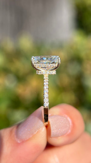 The Jenni features a lab grown round radiant with a beautiful double hidden and secret halo set in a modern floating setting. The gorgeous secret halo follows the shape of the center stone to create a beautiful design that is for your eyes only. Diamonds sit on the pave band to add brilliance and fire to a beautiful modern pave setting. The radiant diamond is nicely elongated, looks like a 3.80ct