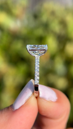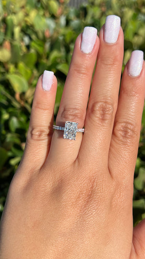The Jada features a lab grown radiant diamond in a tiffany floating setting. The Jada uses a 2mm pave classic diamond band to create a gorgeous dainty style that blends modern with timeless. The radiant diamond is elongated and cut like a 2.80ct size