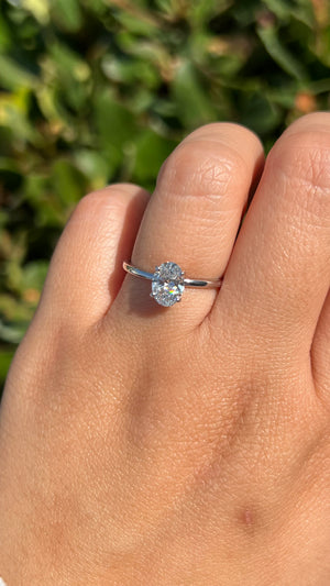 The Evie features a lab grown oval diamond set in a tiffany floating setting. The Evie uses a 1.6mm gold band that centers all the focus onto the diamond. The oval diamond is elongated and cut like a 1.20ct size