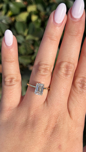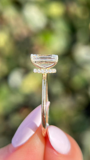 The Sophi features a lab grown emerald diamond with a beautiful hidden secret halo set in a modern solitaire setting. The gorgeous secret halo follows the shape of the center stone to create a beautiful design that is for your eyes only. The Sophi uses a 1.7mm gold band that centers all the focus onto the diamond. The emerald diamond is elongated and cut like a 2.70ct size