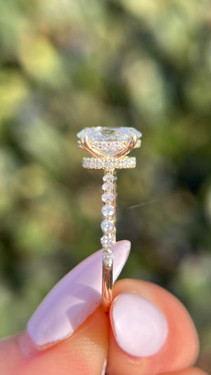 The Irina features a lab grown oval diamond with a unique double hidden secret halo set in a modern floating setting. Inspired by our popular Iris and Sandy setting, the Irina is a beautiful combination of what makes both those rings so popular. The gorgeous secret halo inspired by the Sandy ring follows the shape of the center stone to create a beautiful design that is for your eyes only. Taking inspiration from our Iris setting, stunning round brilliant diamonds are set in a shared prong setting to create this beautiful bubble-style. The oval diamond is elongated and cut like a 1.80ct size