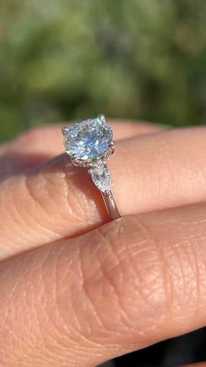 The Polly features a lab grown round diamond in a 3-stone semi-cathedral setting. The Polly is a 3-stone setting that uses 2 large, gorgeous, sparkly pear diamond to create a mesmerizing, unique design. For additional uniqueness, the Polly comes with a stunning diamond bridge that meshes well with the dainty tulip/petal prongs.  3-stone rings represent the past, present, and future.