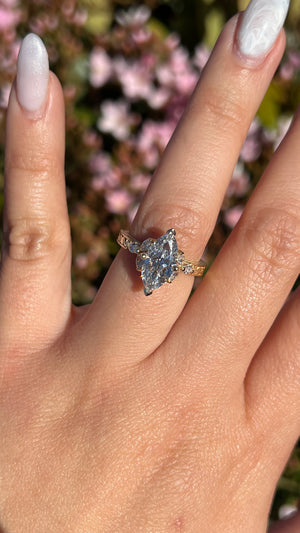 The Mila is a vintage-inspired marquise engagement ring that blends bold sparkle with handcrafted detail. A marquise center diamond is framed by three marquise accents on each side, creating a flowing, winglike silhouette that elongates the finger with elegance. The band is hand-engraved in warm yellow gold, giving it an heirloom touch. From the side, the 3D gold design in the gallery adds depth and artistry, making The Mila as striking from the side as it is from the front.