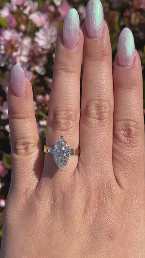 The Andrea features a lab grown marquise diamond set in a stunning floating solitaire setting. The Andrea is a trendy and thicker solitaire than usual. Tulip prongshold the center diamond in place. This adds another fresh layer of uniqueness without ever changing the parts that make the Andrea so popular. It uses a 3.4mm comfort fit solitaire band that focuses all the attention on the gorgeous marquise diamond. The marquise diamond is elongated and cut like a 4.10ct