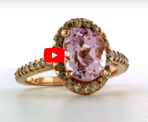 Pretty in Pink, this exquisite gemstone is widely known as a "woman's gemstone. Situated in the center is a bright pink 2.76 carat oval-cut kunzite gemstone. Surrounding the center stone is an oval-shaped halo of shimmering round brilliant diamonds. Surfing down the shank is an array of sparkling round diamonds in pave setting.