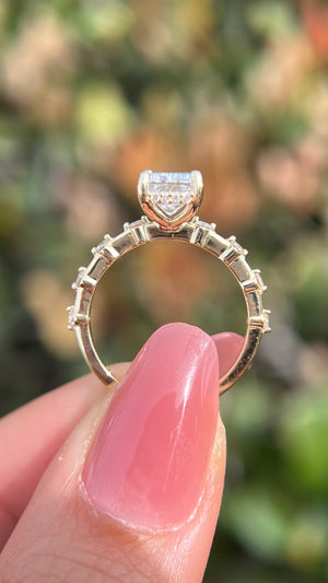 The Bella features a lab grown elongated cushion diamond with a hidden halo in a tiffany floating setting. The Bella utilizes a spaced diamond band style to create a beautiful dainty design that maintains focus in the center. The cushion is nicely elongated and it looks like a 1.90ct size