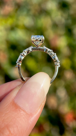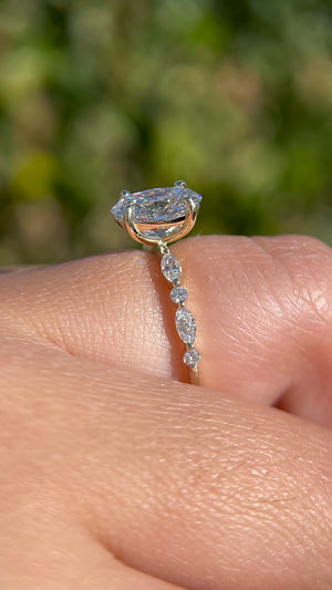 The Myra features a lab grown oval diamond in a tiffany floating setting. The Myra is a unique ring that utilizes natural marquise and round diamonds on the band. The oval diamond is elongated and cut like a 2.15ct size
