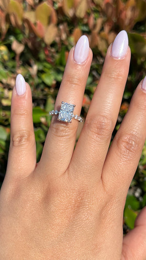 The Isa features a lab grown radiant diamond with a hidden halo set in a tiffany floating setting. The Isa uses a larger bubble diamond band setting that utilizes the shared prong setting. This allows the side diamonds show less gold and to sparkle more brilliantly. The radiant is nicely elongated and looks like a 3.35ct size.