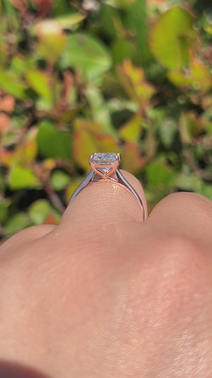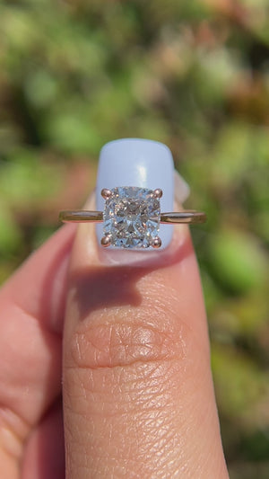 The Ava features a lab grown cushion diamond set in a solitaire cathedral setting. The Ava uses a 1.6mm gold band that centers all the focus onto the diamond.
