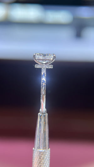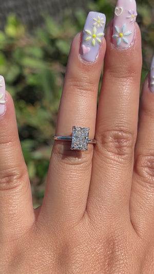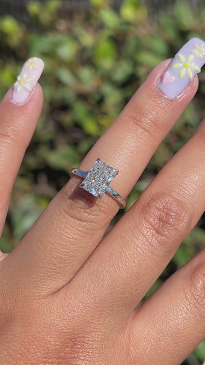 The Sophi features a lab grown radiant diamond with a beautiful hidden secret halo set in a modern floating setting. The gorgeous secret halo follows the shape of the center stone to create a beautiful design that is for your eyes only. The Sophi uses a 1.7mm gold band that centers all the focus onto the diamond. The radiant diamond is elongated and cut like a 2.30ct size