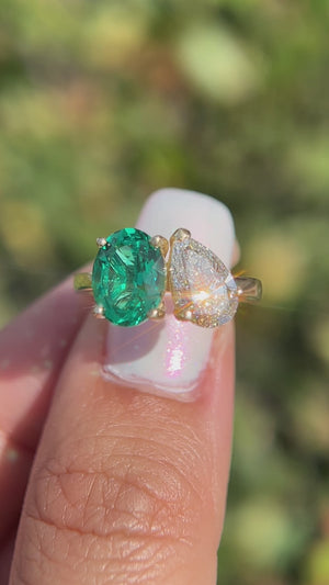 Toi Et Moi 1.56ct E-VS1 Pear Cut Lab Grown Diamond 1.75ct Oval Chatham Lab Emerald Engagement Ring 14K