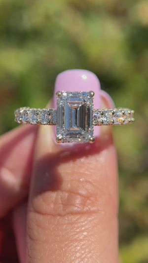 The Christi features a stunning lab grown emerald diamond with a hidden halo set in a tiffany floating setting. The Christi is an absolute eye-catcher. The band features a u-prong setting with stunning 2.8mm F-VS clarity lab grown round brilliant diamonds. In order to maximize sparkle, the u-prong feature all natural diamonds in a 3D setting. A total of 4.68ct of diamonds sit in this elegant engagement ring. The emerald diamond is elongated and cut like a 3.40ct size.
