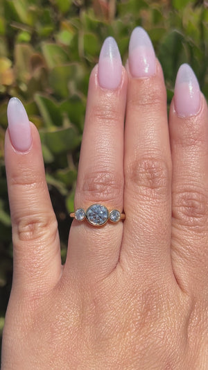 The Brenda is a refined 3-stone engagement ring with a modern bezel setting that balances security and style. Featuring a round center diamond framed by two matching side stones, this design highlights clean lines and everyday wearability.