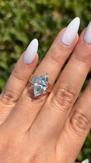 The Andrea features a lab grown marquise diamond set in a stunning floating solitaire setting. The Andrea is a trendy and thicker solitaire than usual. It uses a 5.4mm comfort fit solitaire band that focuses all the attention on the gorgeous marquise diamond. The marquise diamond is elongated and cut like a 3.80ct